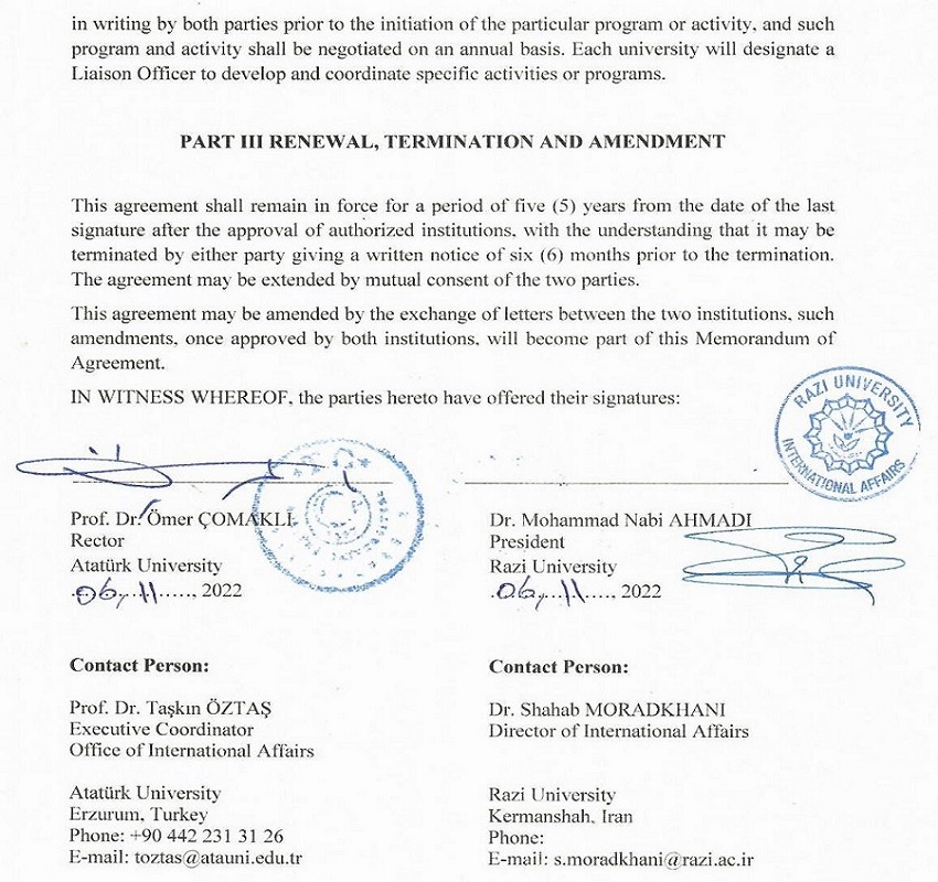 در چارچوب گسترش همکاری‌های علمی بین المللی دانشگاه رازی با دانشگاه­‌های خارجی، تفاهم‌نامه دوجانبه‌­ای با دانشگاه آتاتورک کشور ترکیه به امضا رسید.
