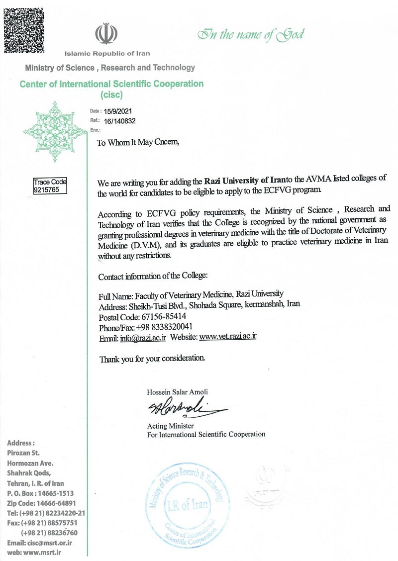 به گزارش روابط عمومی دانشگاه رازی، دکتر شهاب مرادخانی اظهار داشت: با پیگیری‌ها و تلاش‌های مستمر و مجدّانه اعضای محترم هیأت علمی دانشکده دامپزشکی دانشگاه رازی و پیگیری دفتر همکاری‌های علمی بین‌المللی و مساعدت مرکز همکاری‌های علمی بین‌المللی وزارت متبوع، دانشکده دامپزشکی دانشگاه رازی در لیست دانشکده‌های مورد تأیید انجمن دامپزشکی آمریکا (American Veterinary Medicine Association)، که به اختصار AVMA نامیده می‌شود، قرار گرفت.