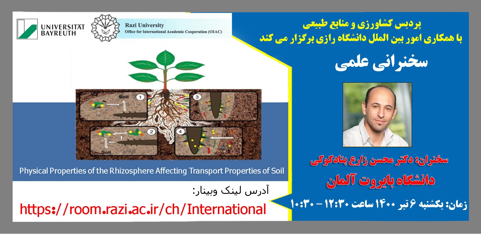 با توجه به گسترش تعاملات بین الملل دانشگاه در حوزه های مختلف، سخنرانی علمی با عنوان Physical Properties of the Rhizosphere Affecting ،Transport Properties of Soil با همکاری پردیس کشاورزی ششم تیرماه برگزار گردید. آقای دکتر محسن زارع مدیر گروه خاک شناسی دانشگاه بایروت آلمان می باشند.