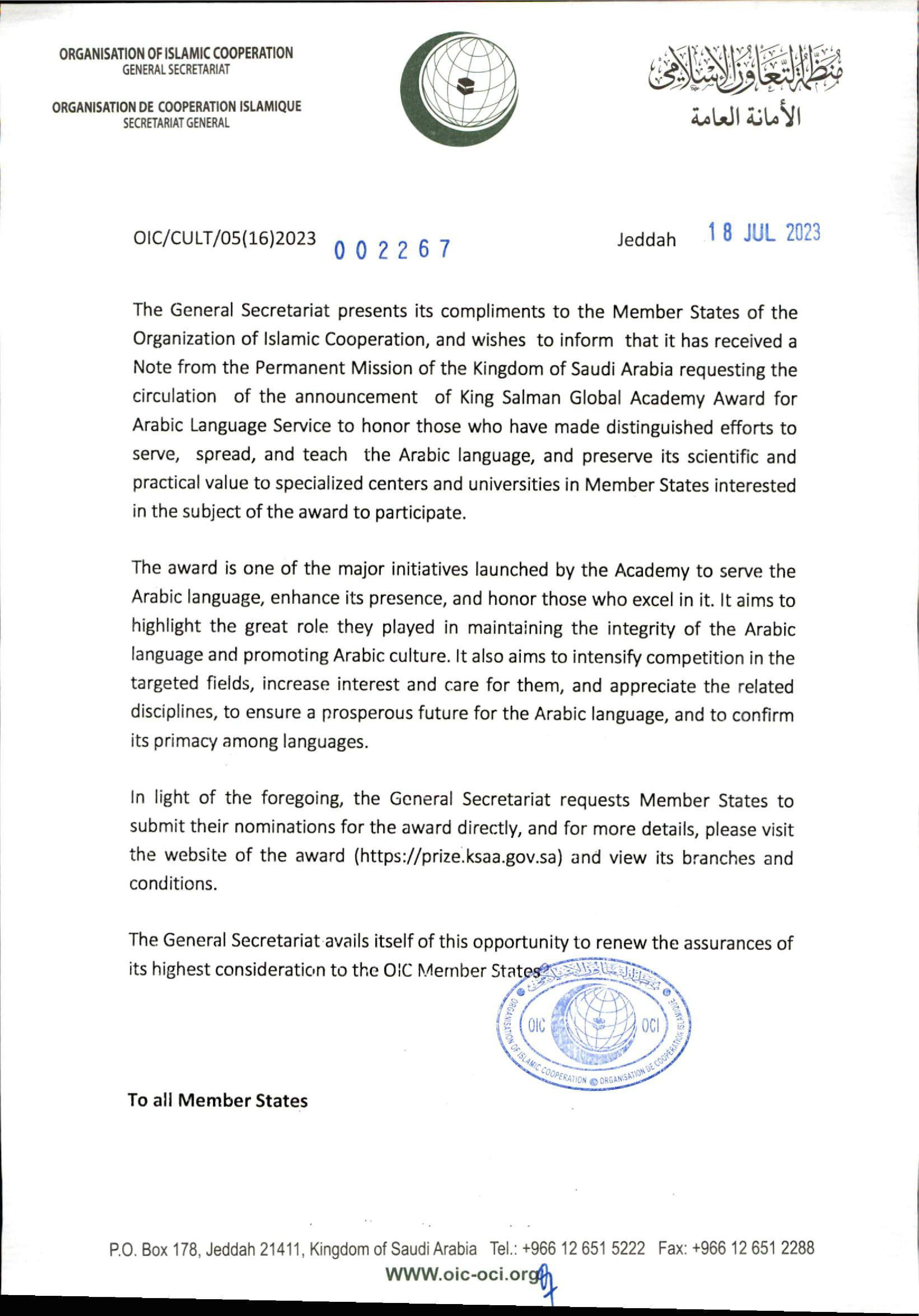 دبیرخانه سازمان همکاری اسلامی از اعلام نمایندگی دایم عربستان سعودی درخصوص جایزه آکادمی بین المللی ملک سلمان برای فعالان در زمینه آموزش، تعلیم و ترویج زبان عربی خبر داد. جهت کسب اطلاعات بیشتر پیوست ذیل را مشاهده فرمایید.