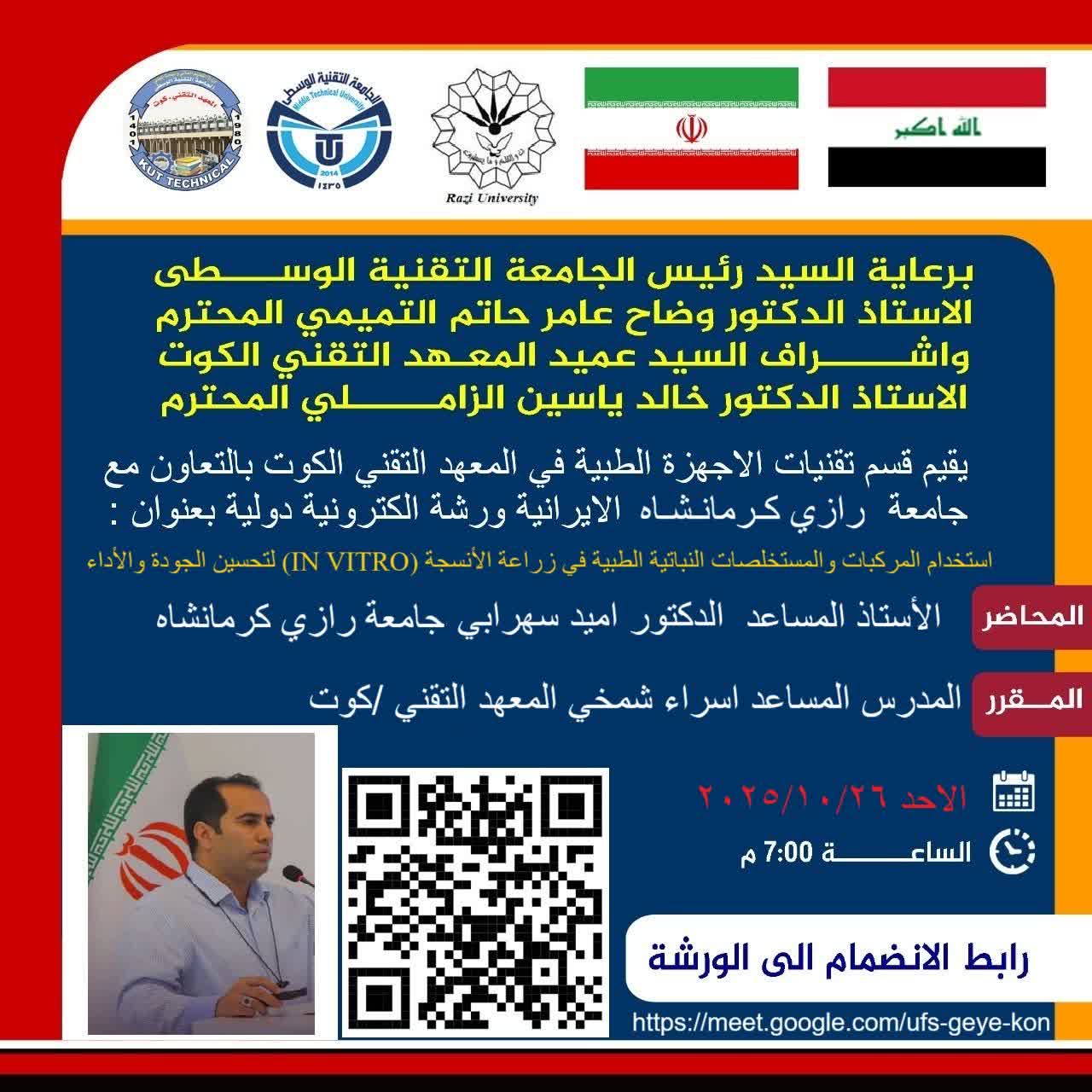 دکتر امید سهرابی از گروه مهندسی باغبانی، اولین کارگاه را برای این دانشگاه با عنوان "The effect of medicinal plants extract on tissue culture" برگزار نمود.