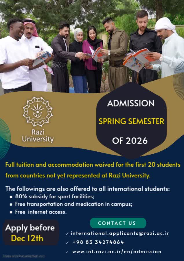 Razi University is pleased to announce the admission of international students for undergraduate, master’s, and doctoral programs for the spring semester of the 2025-2026 academic year.
